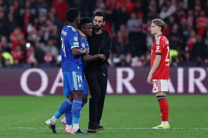 Real Madrid faced some staggering challendges on the pitch, but not on tactics. Prestianni, the Benfica’s Argentine winger, was seen covering his mouth with his shirt while speaking to Vinicius during the altercation, which occurred in the second half right after Vinicius Jr scored the deciding goal for Real Madrid. Vini became visibly upset and immediately reported to the referee that Prestianni had directed a racist insult at him. Vini sat on the bench for a while and refused to return to the field. Players from both teams shove each other, which caused an approximate 10-minute suspension of the game. The referee activated the anti-racism protocol, and the match resumed in 8 minutes.